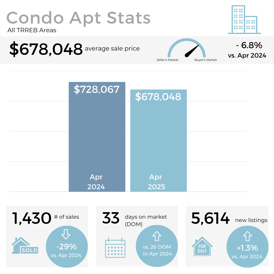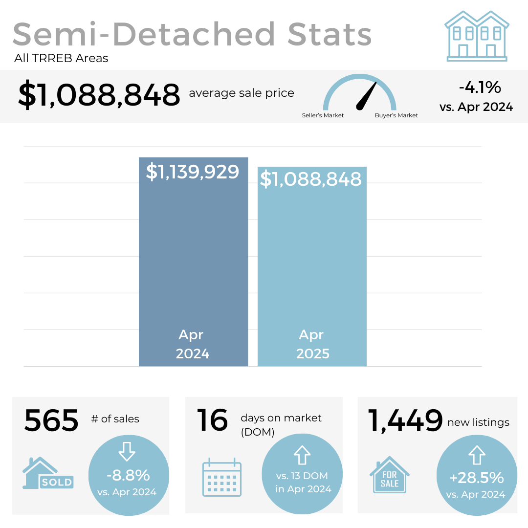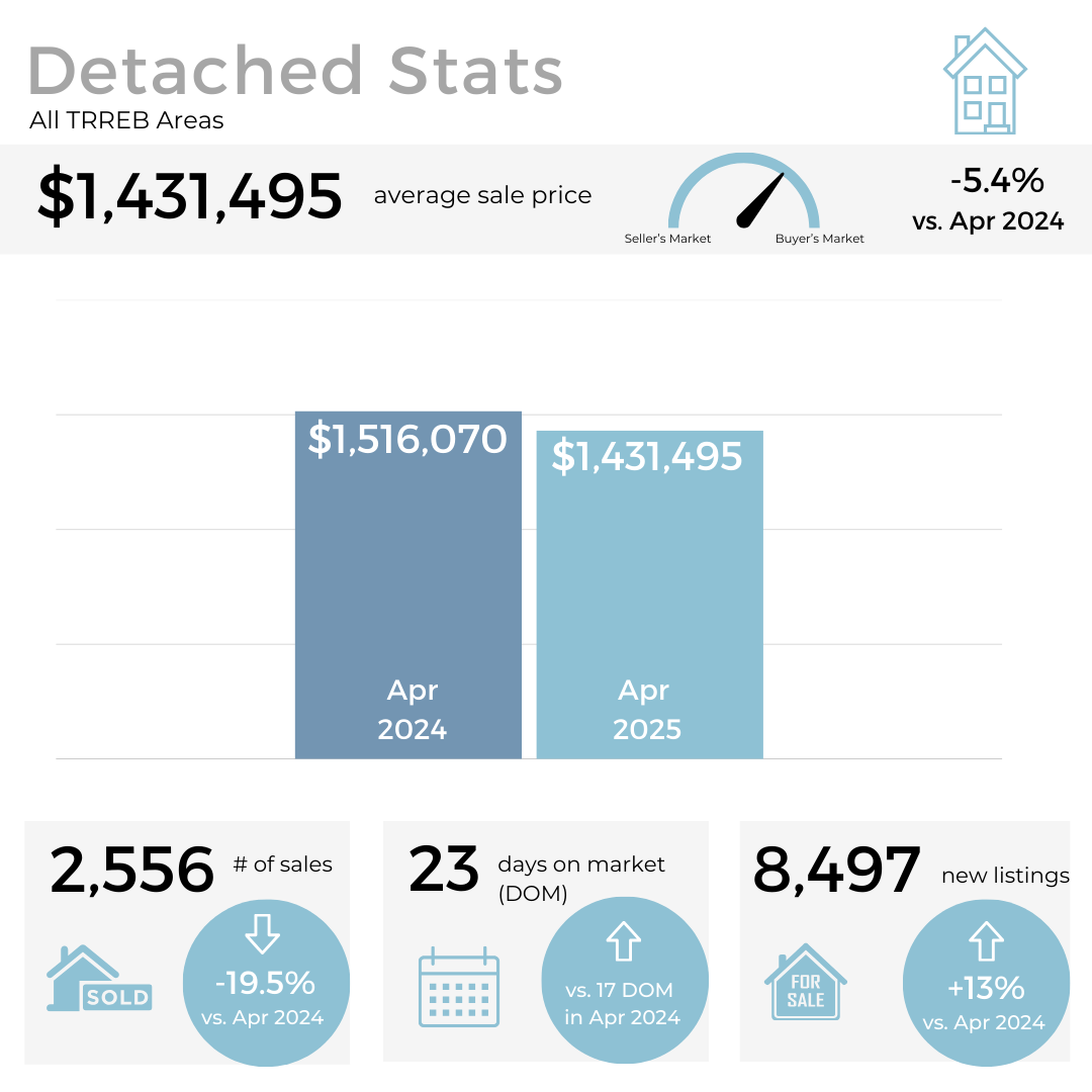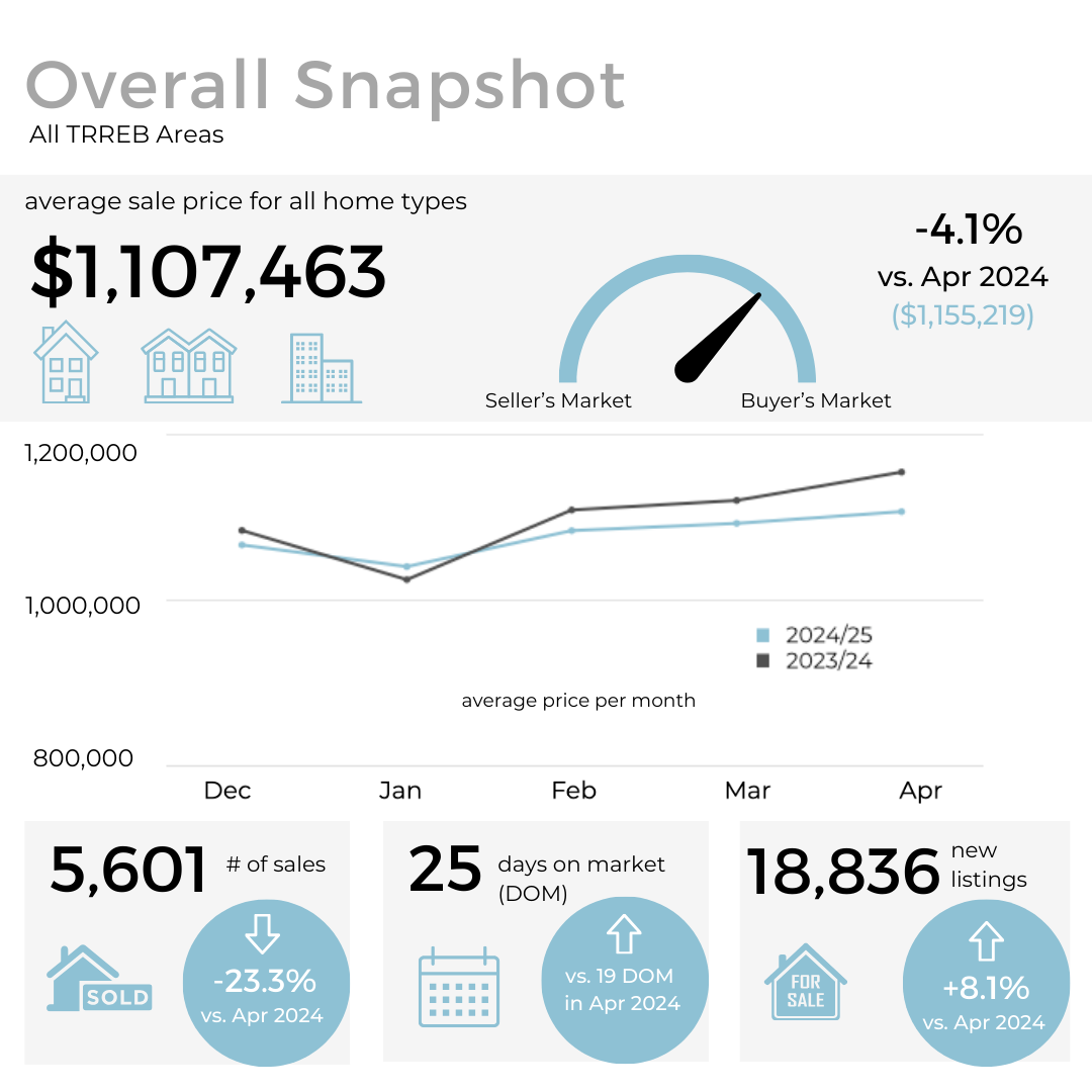 In this month’s Toronto real estate market update, Alex takes a closer look at the numbers from April 2025, revealing a slow start to the traditionally busy spring season. Average sales are down 23% compared to the same time last year, while active listings are up—showing that homes are staying on the market longer and buyer confidence remains low.
