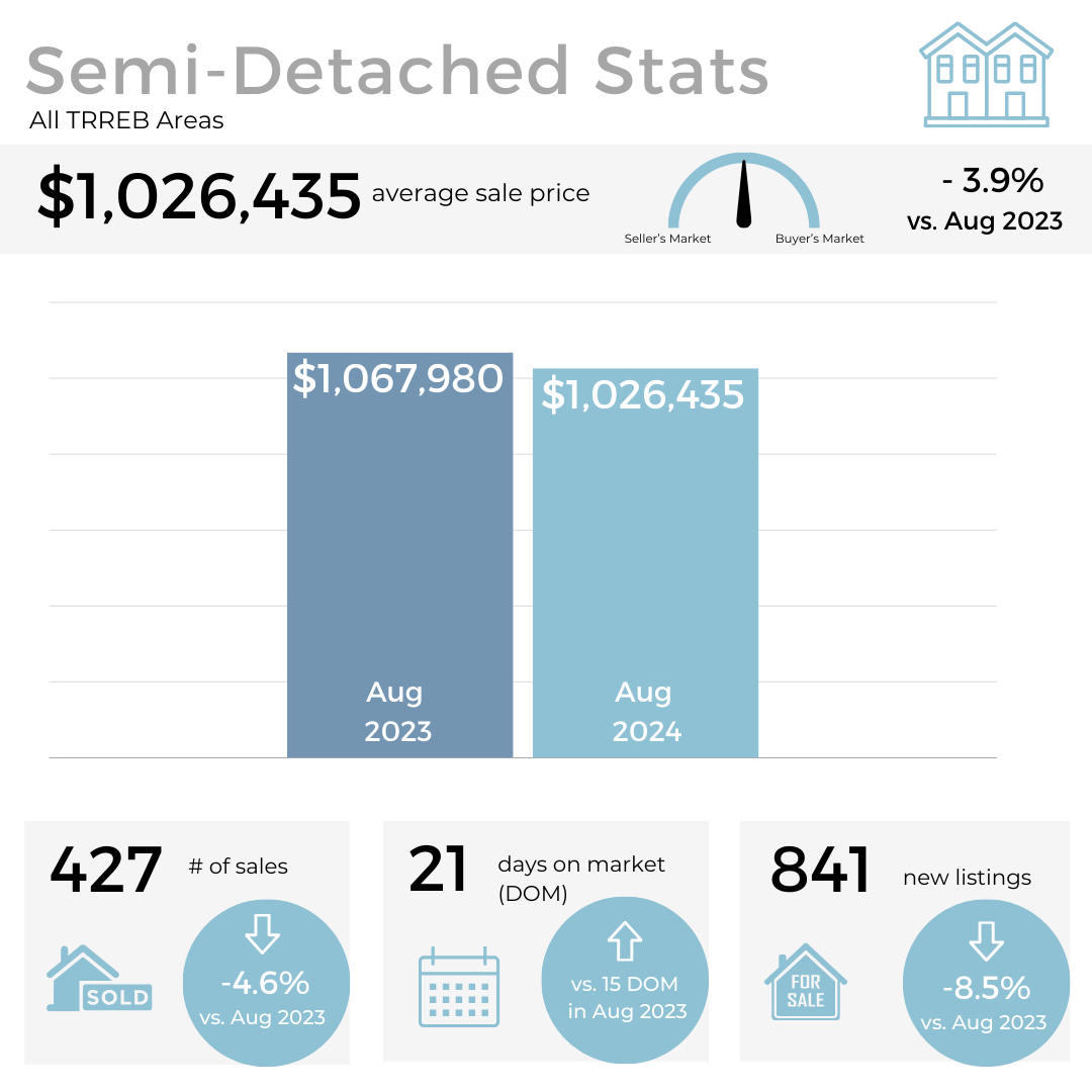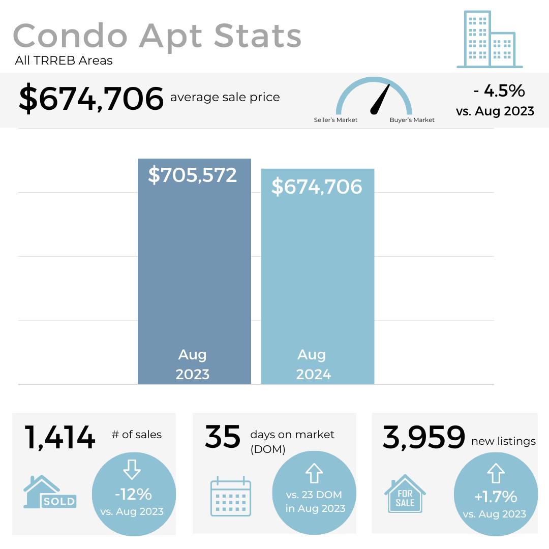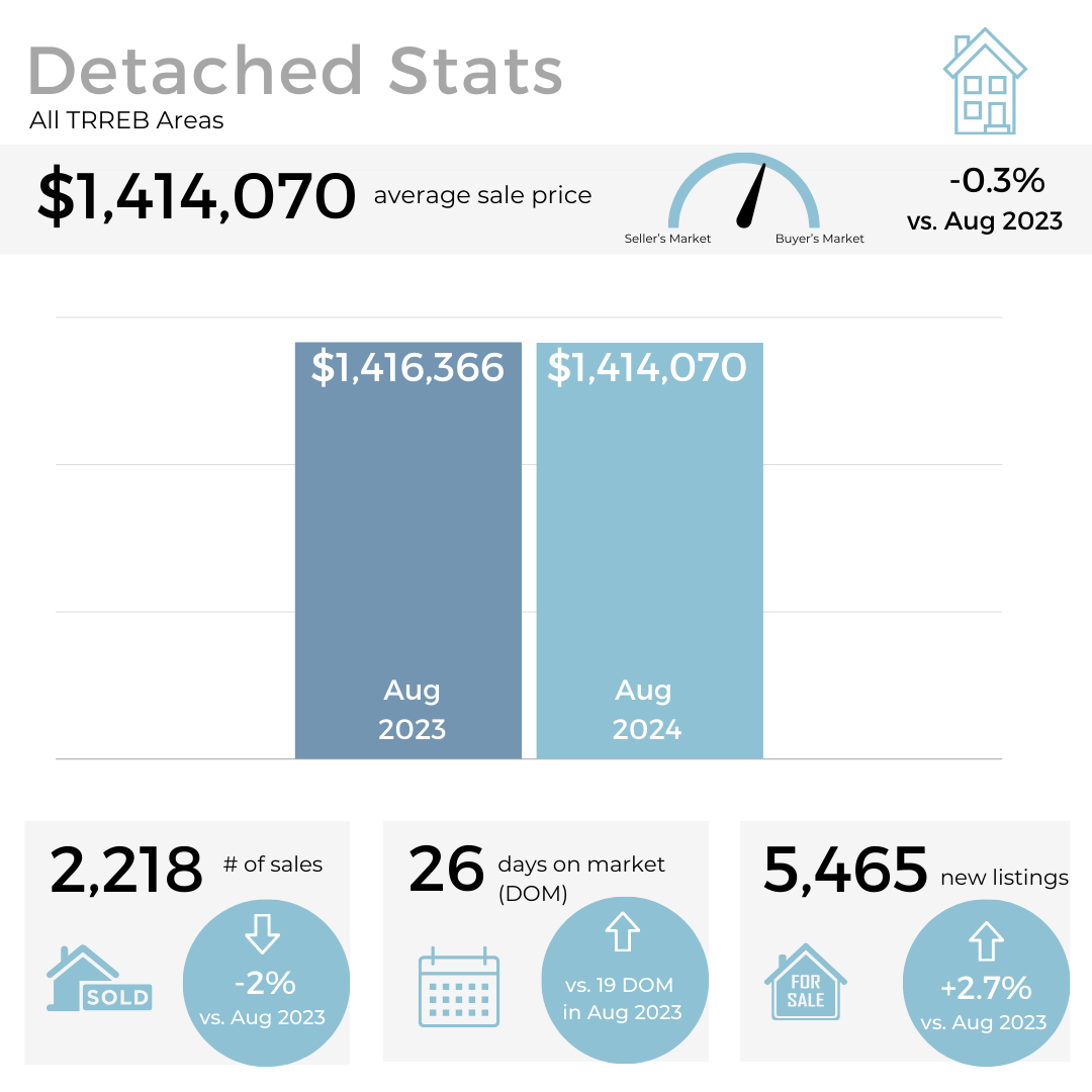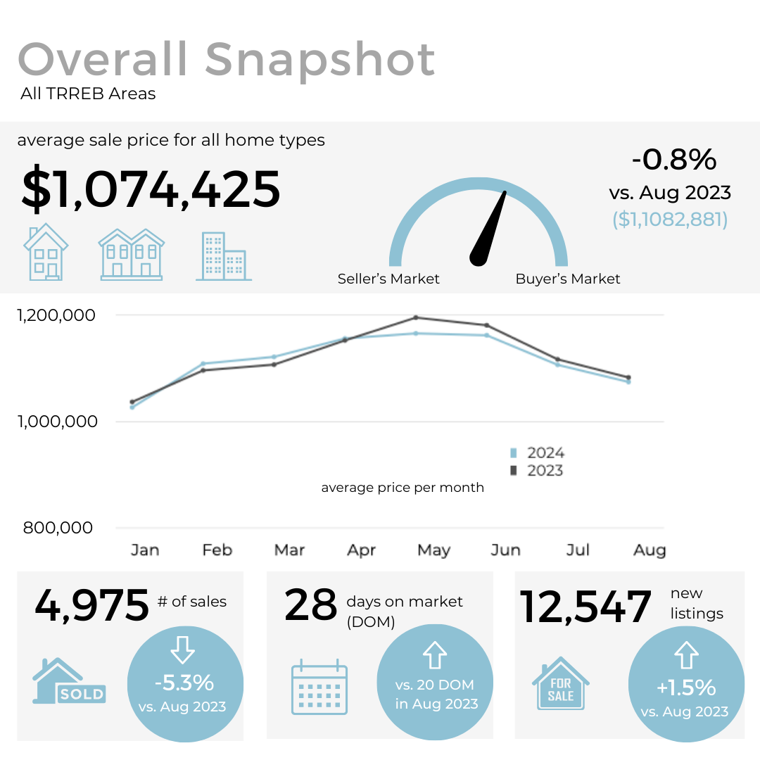 The Toronto Regional Real Estate Board reported a drop in home sales for August compared to last year, with average home prices also seeing a slight decline. A total of 4,975 homes were sold in the Greater Toronto Area, representing a 5.3% decrease from the 5,251 sales in August 2023.