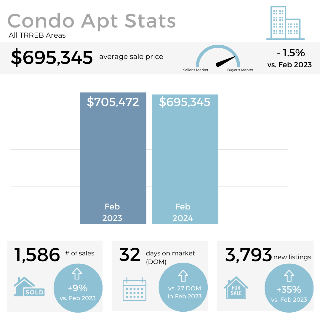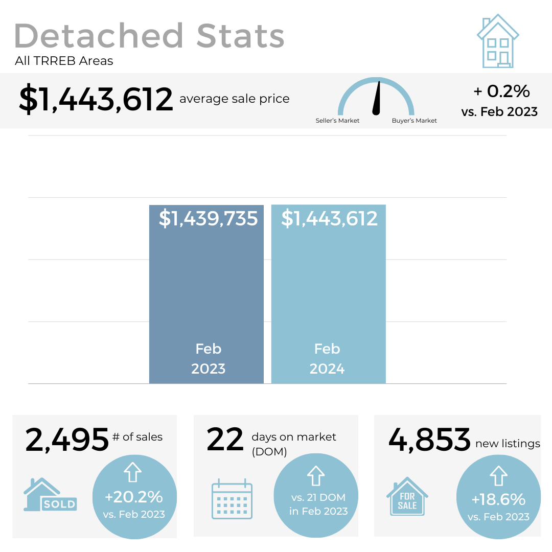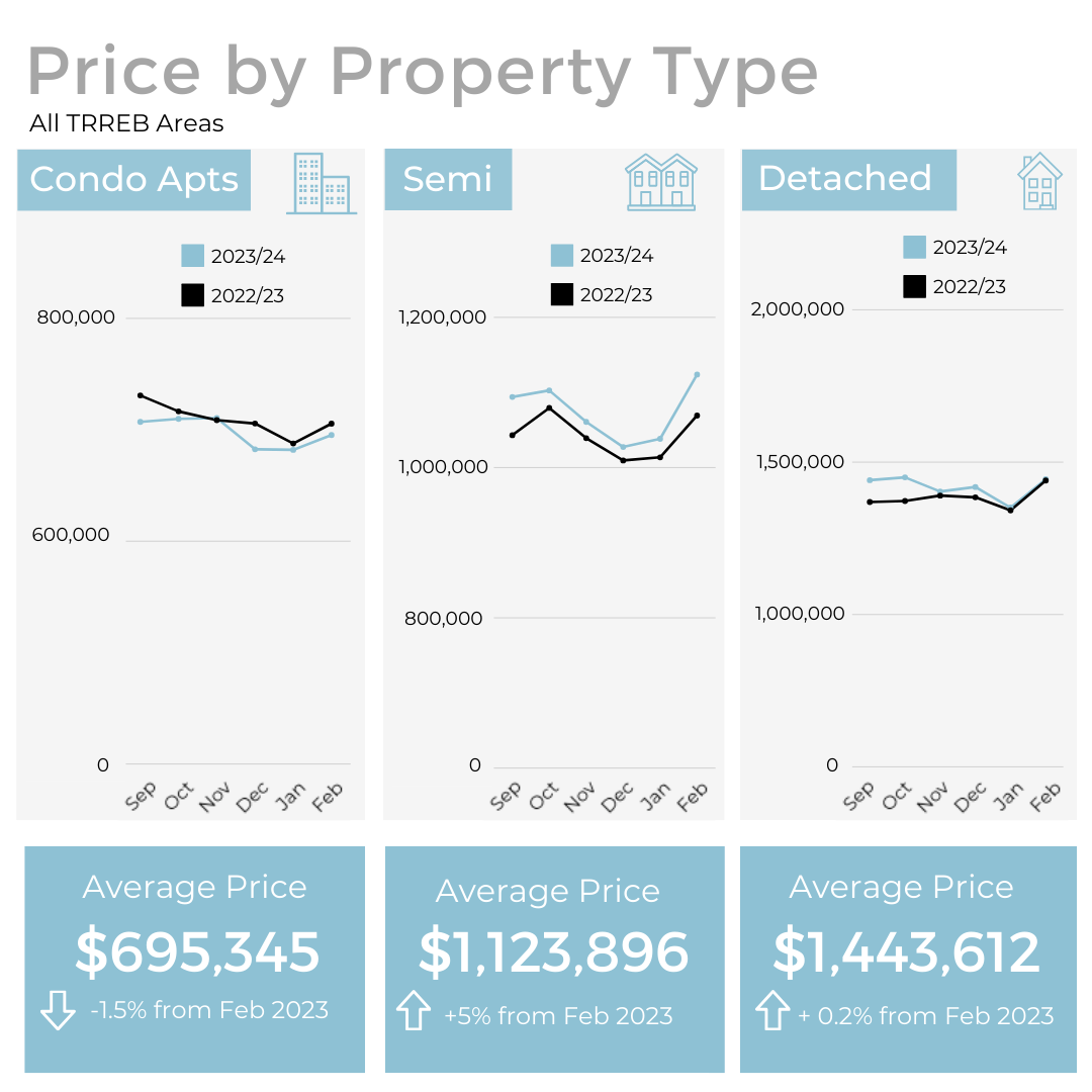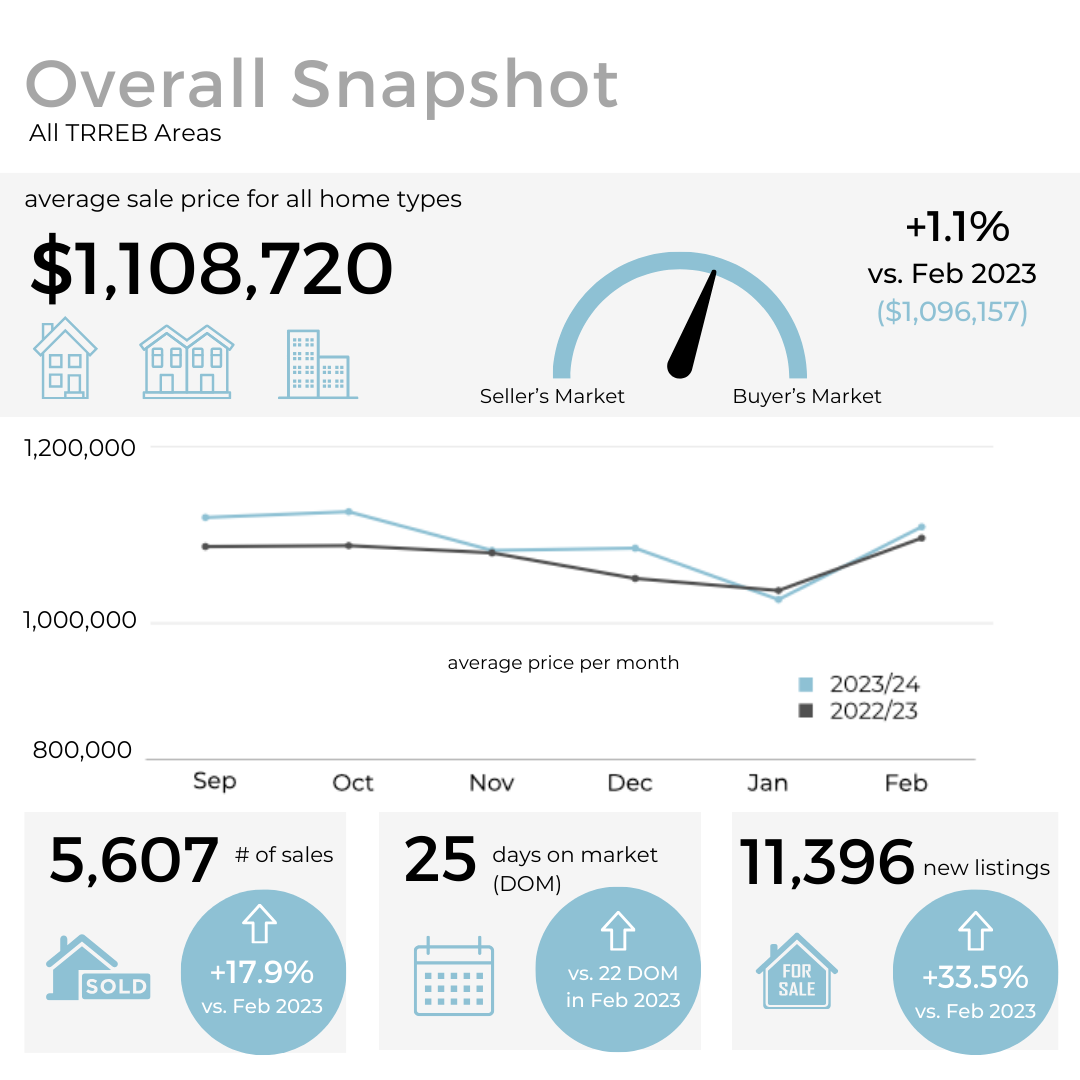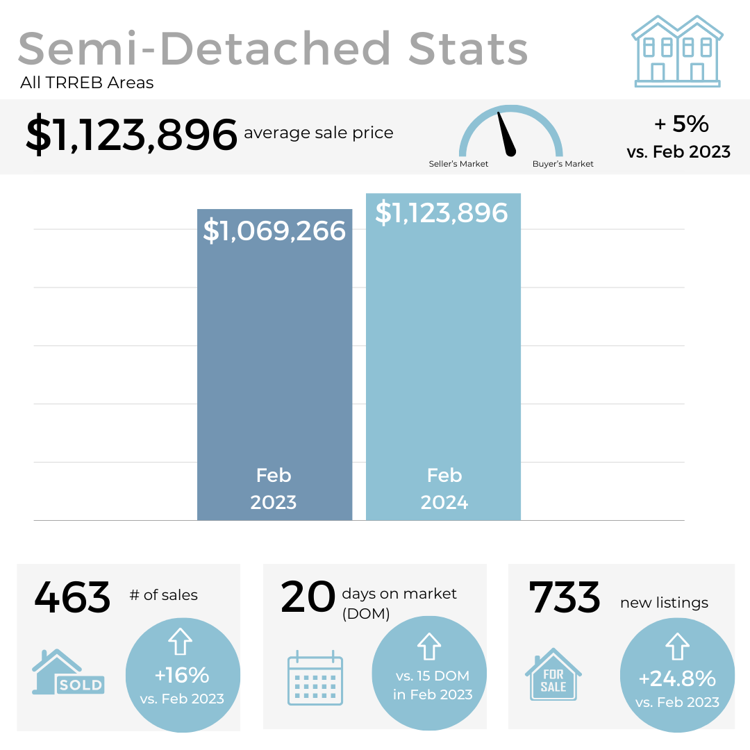 In February, both home sales and new listings in the GTA saw an increase compared to the same period in 2023, as well as on a month-to-month basis. Additionally, selling prices showed a slight upward trend compared to last year.