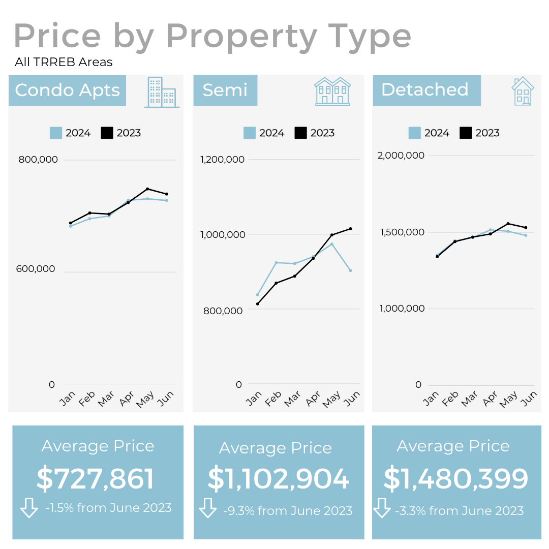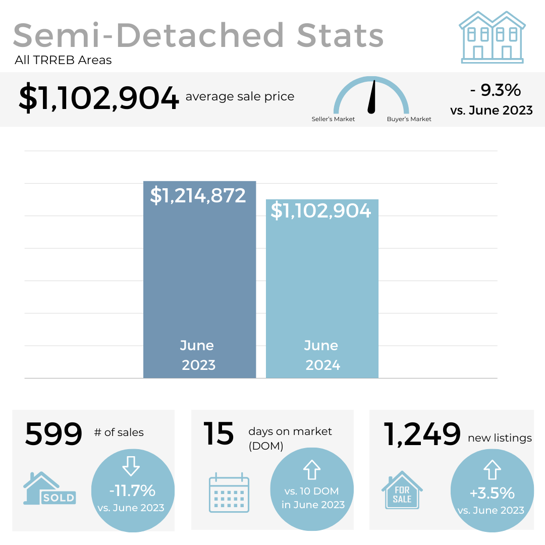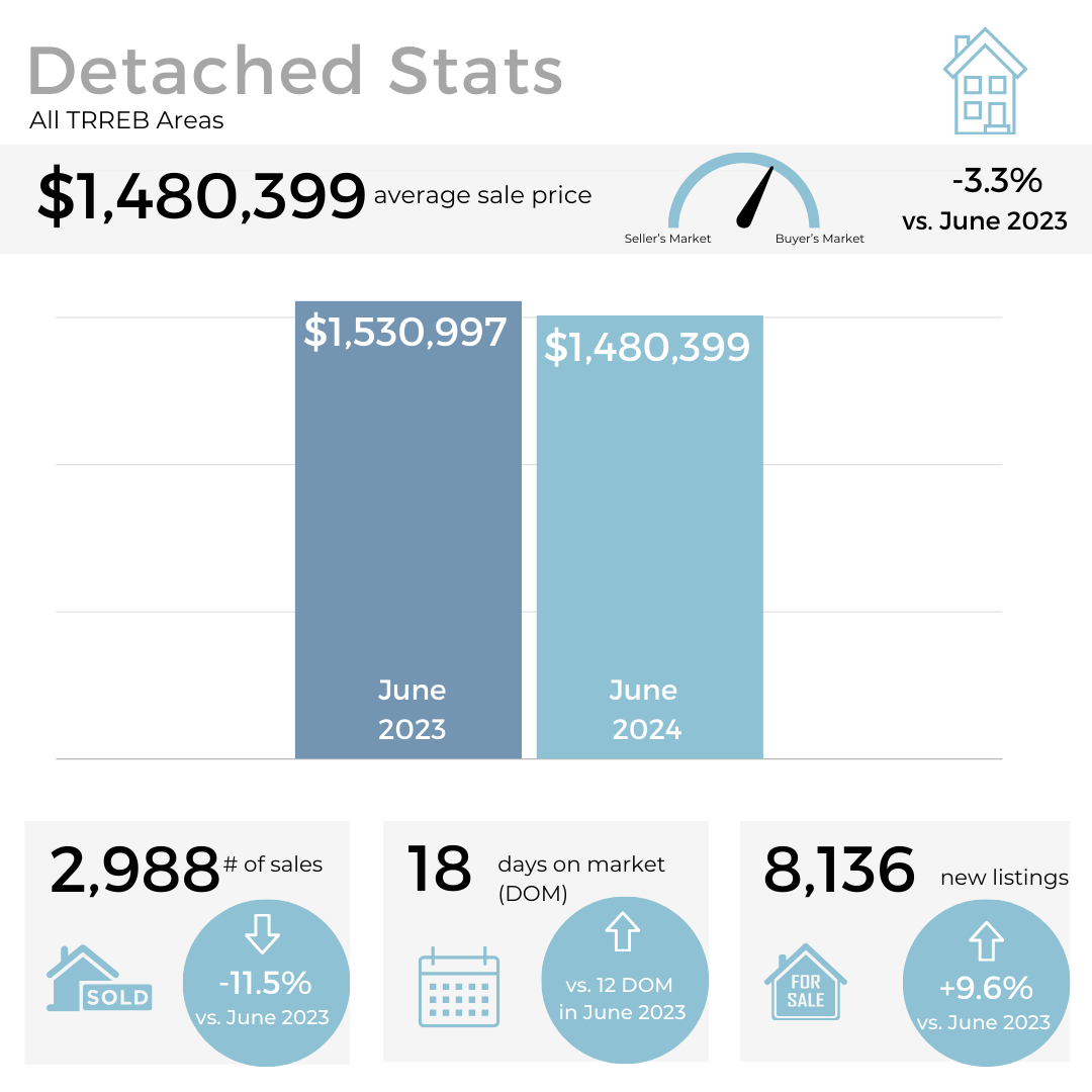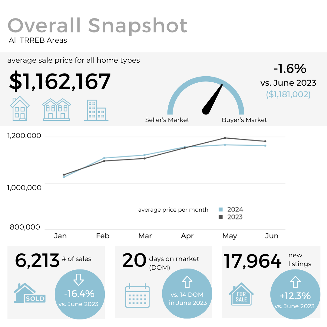 In June 2024, home sales in the GTA saw a significant drop of 16.4% compared to the same month last year, despite a recent rate cut by the Bank of Canada. Active listings were up 67% year-over-year, leading to a slight dip in the average selling price which now sits at $1,162,167.